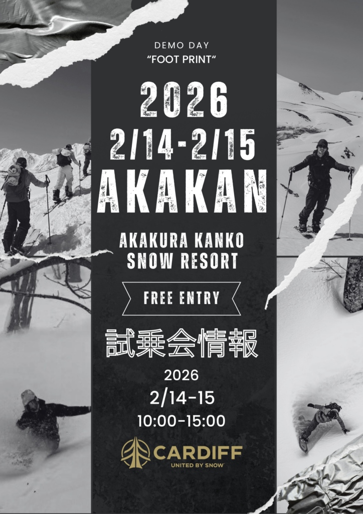 2月14日 CARDIFF SNOWCRAFT試乗会 2026.02.11News 開催日程:2/14㈯2/15㈰ 10:00-15:00(最終貸出14:30)貸出条件:顔写真入り身分証明書提示 / エントリーフォーム記入開催場所:赤倉観光リゾートスキー場 スカイケーブル乗り場付近 詳しくはこちら
